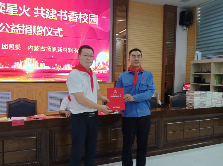 “贈一縷書香,傳一份真情”。為提升學(xué)生文化素養(yǎng),推進(jìn)書香校園建設(shè),營造書香文明社會氛圍,引導(dǎo)同學(xué)們多讀書、讀好書,形成讀書熱潮,7月11日,由內(nèi)蒙古自治區(qū)青少年發(fā)展基金會發(fā)起,團(tuán)盟委協(xié)辦,揚帆新材子公司內(nèi)蒙古揚帆參加的“點燃閱讀星火 共建書香校園”圖書捐贈儀式在阿拉善高新區(qū)第一小學(xué)舉行。