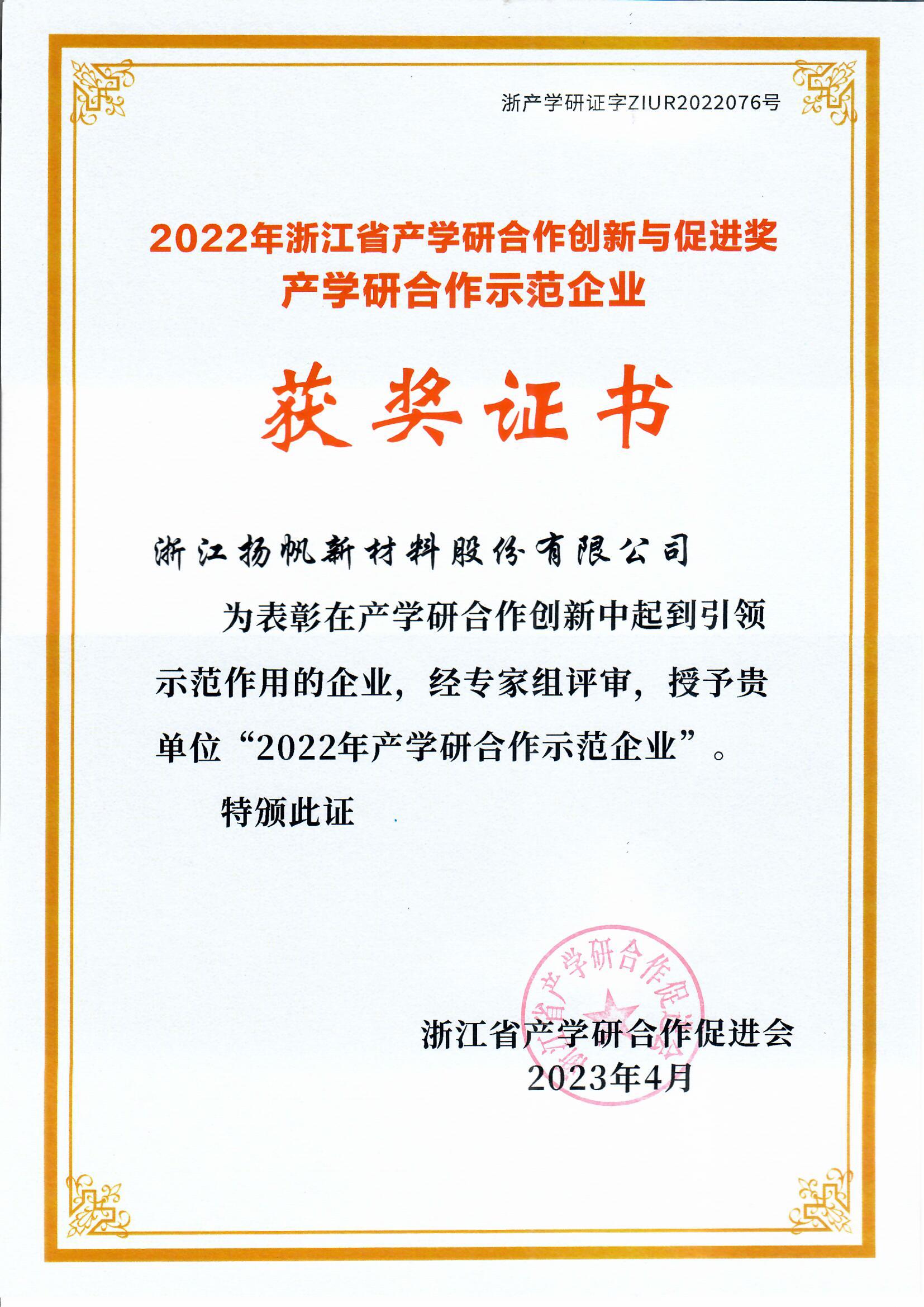浙江杭州 『4月16日』揚帆新材榮獲“2022年浙江省產(chǎn)學(xué)研合作創(chuàng)新與促進獎 產(chǎn)學(xué)研合作示范企業(yè)”