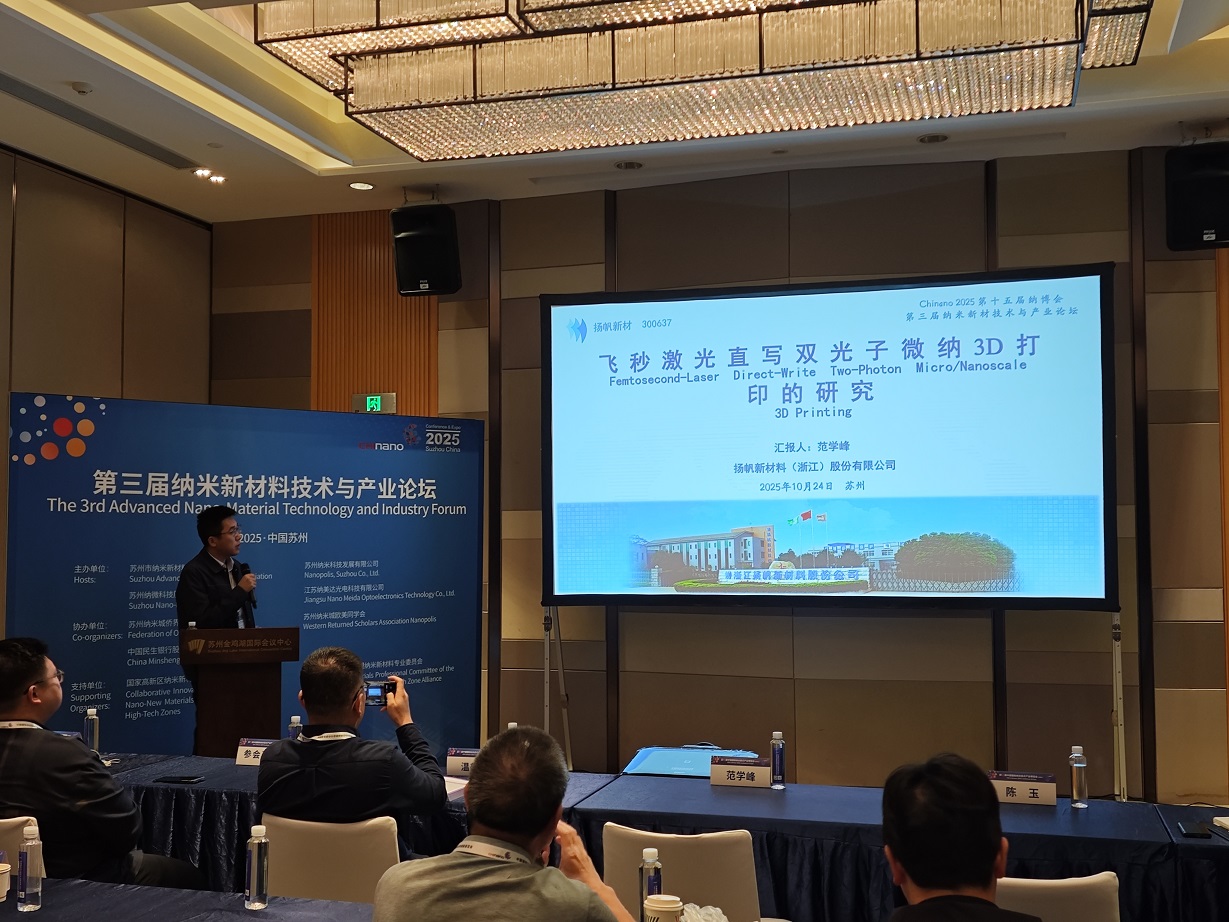 會(huì)議期間,我司研發(fā)項(xiàng)目經(jīng)理范學(xué)峰在納米新材料技術(shù)與產(chǎn)業(yè)論壇中,就《飛秒激光直寫雙光子微納3D打印的研究》做出了精彩的報(bào)告,詳細(xì)闡述了我司在雙光子微納3D打印領(lǐng)域的研究、進(jìn)展與期望。